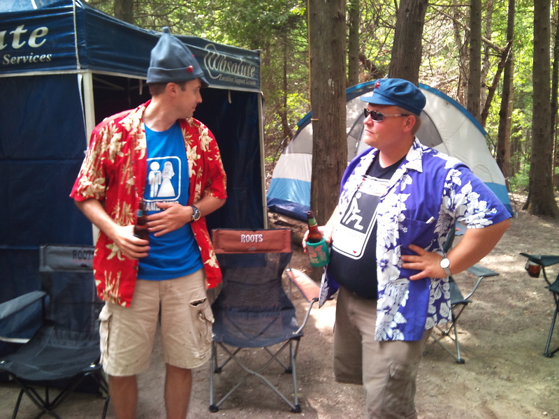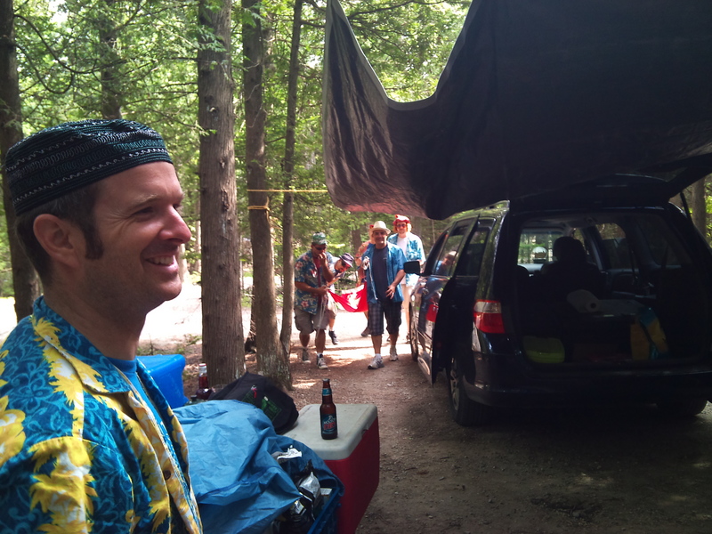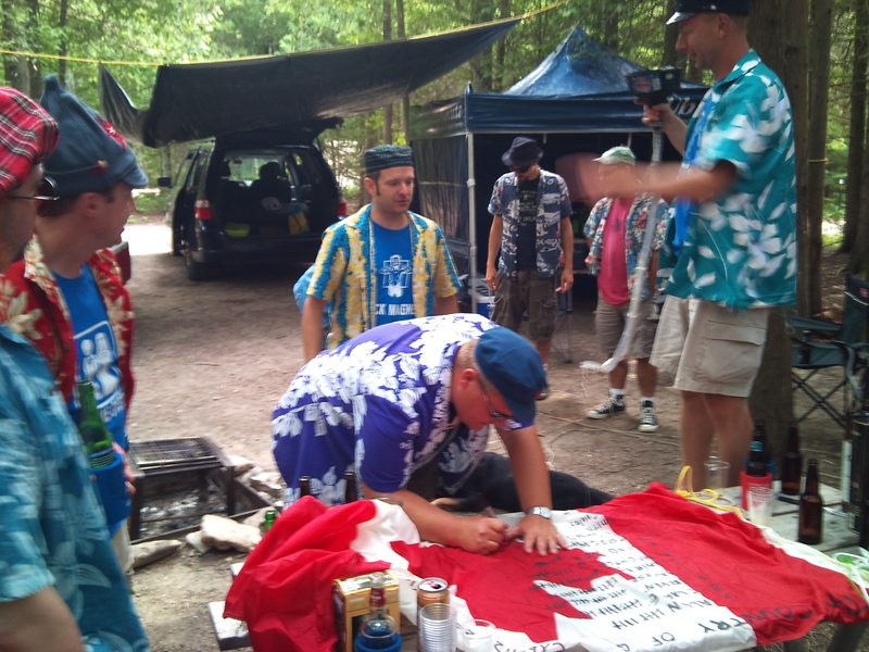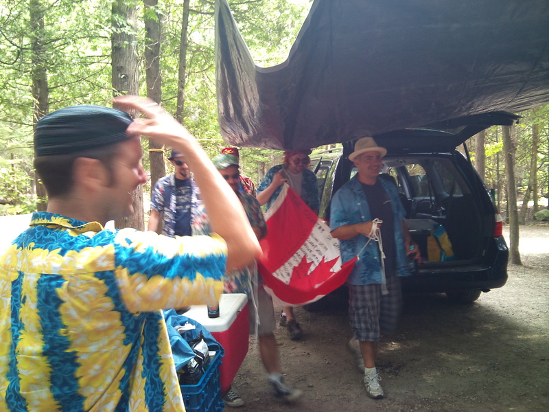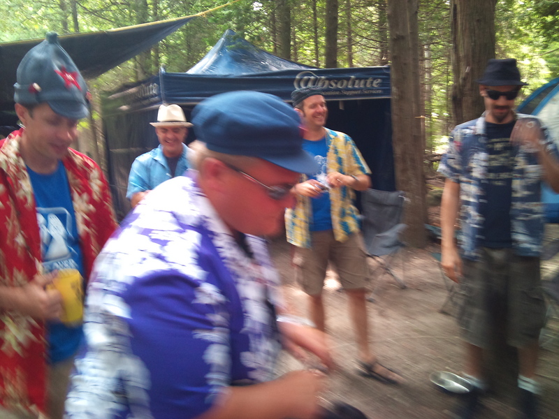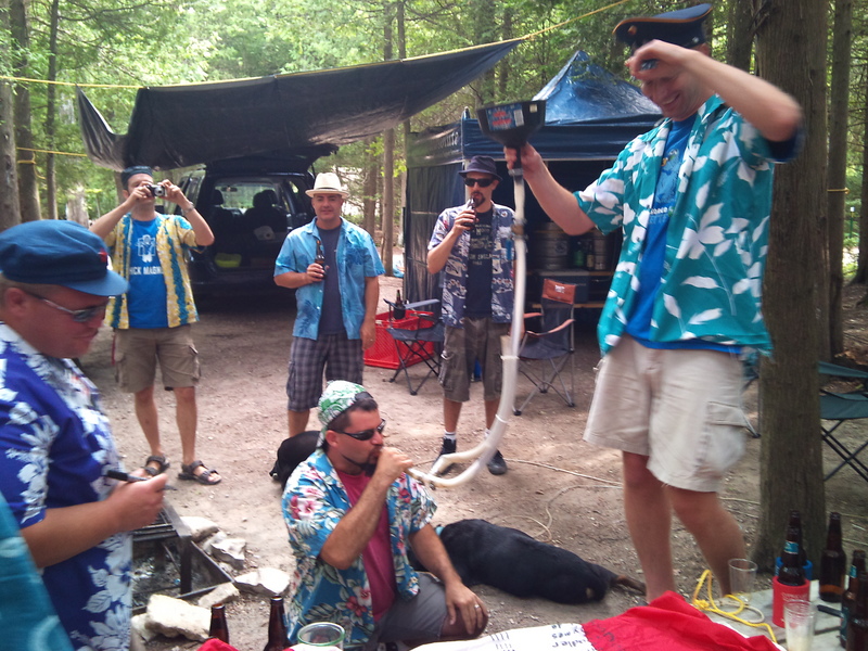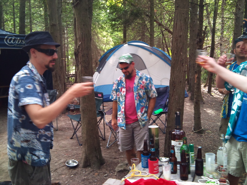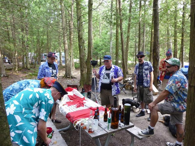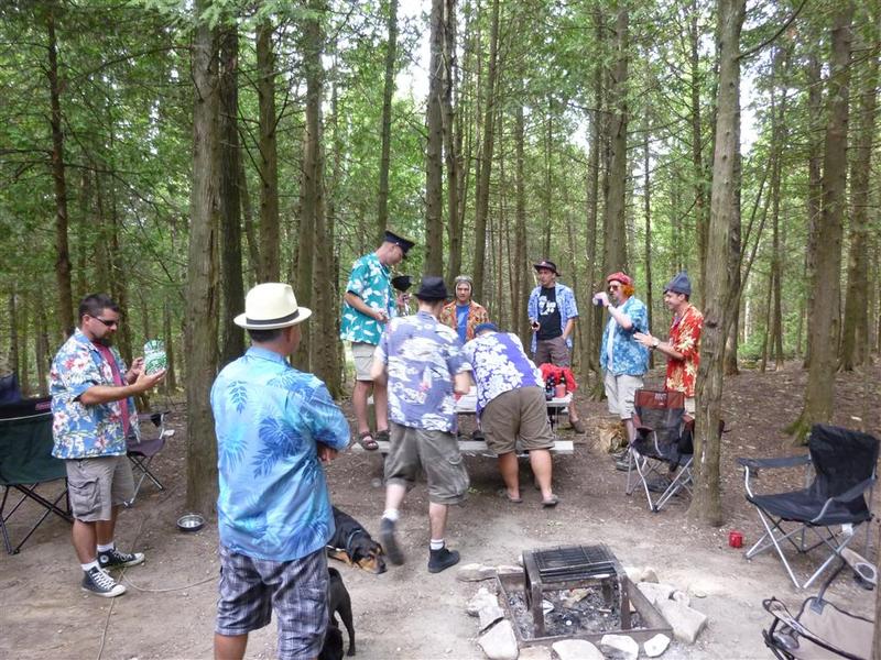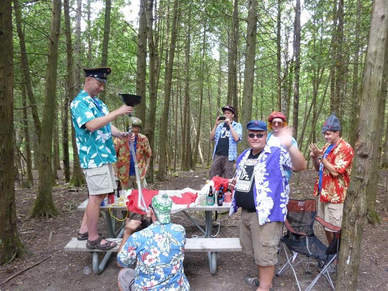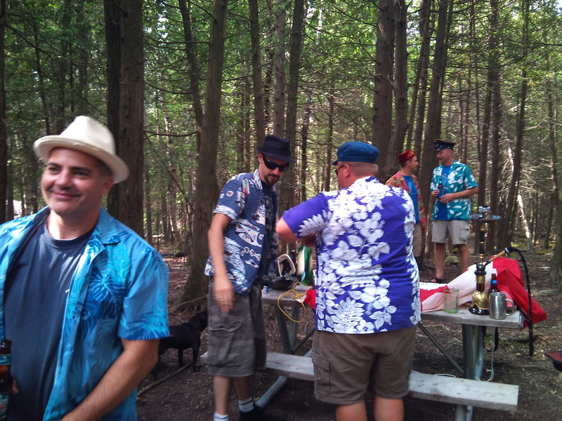 Timelines: Meaford Beer store for 10AM Friday Aug 12th. Groceries were pre-purchased with cool heads. No beer-fever impulse purchases. Convoy over Derry Line to avoid Hwy 26 construction. Brad Clarke’s hand was a dolphin. Several stopped in Wiarton to again impress upon the locals the importance of Hawaiian shirts and pizza. More booze was required, and procured, from the local LCBO.